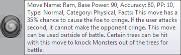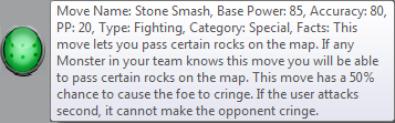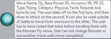 An Ancient Inscription (AI) move is learnt from buying an item from the Market, just like an MT Move. However, unlike MT moves, Monsters can use AI moves to do special things outside of battle like swimming, flying, smashing rocks, and even sliding down waterfalls! Also, unlike MT moves, you can teach an AI move to as many monsters as you like, without having to worry about buying another one! Many of the following AI Moves are essential in passing certain areas in the game.