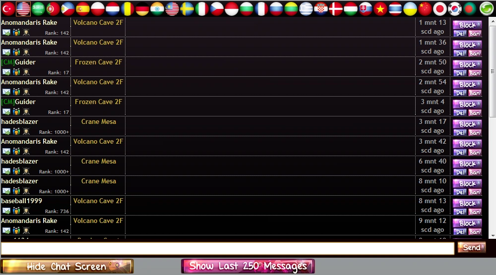 - The Show Last 250 Messages button shows the last 250 posts by all users, excluding any blocked players.