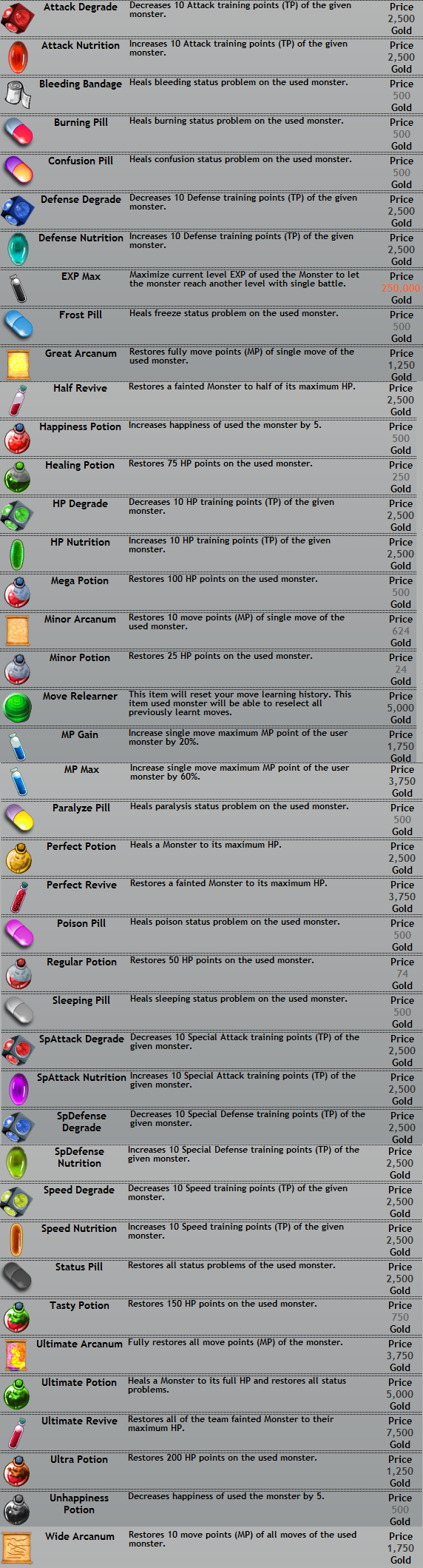 | Happiness Potion | Increases the Happiness of target monster by 5. | 100 | |